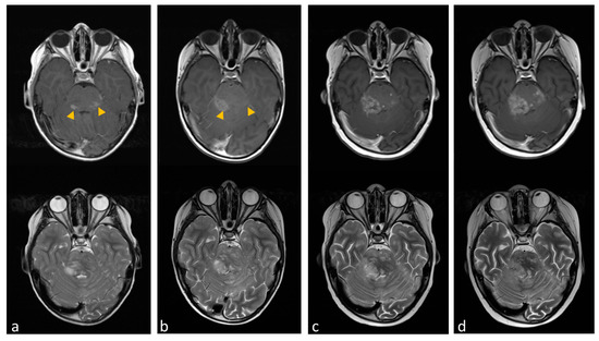 Transverse cranial magnetic resonance imaging (MRI) with T2-weighted turbo spin-echo (TSE) (lower line) and T1-weighted with gadolinium contrast media (upper line). (a) The image shows contrast-enhanced lesions in the pons, particularly in the dorsal portions (yellow arrowheads). (b) Tumor region after one month of miglustat therapy with regressive contrast media uptake in the left pons and progressive contrast enhancement towards the right cerebellum. (c,d) show tumor progression after dose reduction and later discontinuation of miglustat.