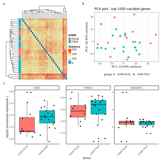Gene expression analysis of DIPG samples (n = 31) with and without the H3K28M mutation. (a) Sample-to-sample distances are represented as an expression heatmap using the variance-stabilized count data. The intensity of square colors and the hierarchical clustering provide a summary of the correlations between H3K28M altered (blue) and not altered (red) genotypes. (b) Gene expression variation among the DIPG dataset, based on the top 1000 variably expressed genes, is displayed in a Principal Component Analysis (PCA) scatter plot. The percentages on each axis correspond to the proportions of variance that the primary components can account for. Samples are colored by the respective genotype: H3K28M altered samples (blue) and samples not containing the H3K28M mutation (red). (c) The log10 normalized expression of the genes UGCG, ST8SIA1, and B4GALNT1 grouped by the genotype. Note, the nomenclature H3K28M is a synonym for the H3K27M mutation.