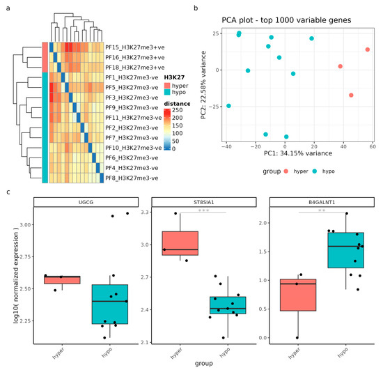 Gene expression analysis was performed on samples from patients with posterior fossa ependymomas (n = 15) to compare those with a low H3K27me3 (hypo) and high H3K27me3 (hyper). (a) Sample-to-sample distances were visualized using an expression heatmap constructed from variance-stabilized count data. The heatmap’s color intensity and hierarchical clustering provide a concise representation of the correlations between hypomethylated (blue) and hypermethylated (red) H3K27 samples. (b) The PCA scatter plot showcases gene expression variation within the GSE89446 dataset, based on the top 1000 variably expressed genes. The percentages displayed on each axis indicate the proportion of variance accounted for by the primary components. Samples are colored by hypomethylation (blue) and hypermethylation (red). (c) Gene expression levels of UGCG, ST8SIA1, and B4GALNT1 are presented as log10 normalized values, categorized according to the methylation status. ** = p-adjusted value < 0.05; *** = p-adjusted value < 0.01.