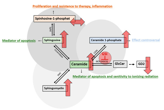 Alterations in sphingolipid metabolism after treatment with GSI. Various enzymes are responsible for the conversion of ceramide into its metabolites, which collectively determine the survival or demise of cells. Blocking the glucosylceramide synthase (GCS), which is encoded by the UGCG gene, with glucosylceramide synthase inhibitors (GSI), leads to an inhibition of glucosylceramide (GlcCer) synthesis. GlcCer is the precursor for the synthesis of gangliosides such as GD2, whose concentration is reduced by using GSI. The concomitant increase in pro-apoptotic ceramide leads to further changes in sphingolipid metabolism. Ceramidase can convert ceramide to sphingosine, which, in turn, can be phosphorylated by sphingosine kinase (SphK) to sphingosine 1-phosphate (S1P). GSI treatment increased sphingosine, which is known to have pro-apoptotic properties, but not S1P, a protective factor known to have proliferative effects on cells. This constellation might be influenced by the TP53 mutational status. Another consequence is the increase in ceramide 1-phosphate formed by ceramide kinases (CERK). The predominantly anti-apoptotic effect of C1P is explained, in part, by the elimination of ceramide associated with CERK activity. However, as precisely this mechanism is prevented by the present high ceramide levels, the anti-apoptotic effect of C1P may be reduced or suppressed by GSI treatment. Additionally, the concentration of sphingomyelin produced by sphingomyelin synthase (SMS) increases as a consequence of the inhibition of GCS. The upward red arrows indicate an increase and the downward red arrows indicate a reduction in the concentration of the respective metabolite after treatment with GSI. The right left arrow shows that no changes in the concentration were observed.