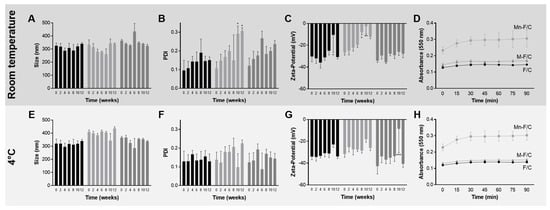 Storage stability of uncoated, Mn-coated, and M-coated F/C nanoparticles, black, light grey, and grey, respectively, at room temperature (top, dark grey) and 4 °C (bottom, grey). Parameter size (A,E), PDI (B,F), and zeta potential (C,G) and concanavalin A agglutination assay (D,H) were determined. Each result represents the mean ± standard deviation for n = 6, from two independent batches. * p < 0.05; ** p < 0.01; *** p < 0.001.