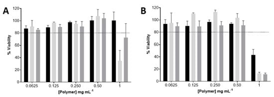The THP-1 monocytes and THP-1-differentiated macrophages viability upon 24 h exposure to uncoated, M-coated, and Mn-coated PEC nanoparticles is presented in Figure 3. The uncoated-F/C nanoparticles resulted in a cell viability higher than 80% for the studied conditions, except for the highest concentration of M- and Mn-coated F/C nanoparticles. For the THP-1-differentiated macrophages, exposure to uncoated and carbohydrate-coated PEC nanoparticles lead to a loss in cell viability at 1 mg mL−1 in the polymer. To ensure the biocompatibility of the PEC nanoparticles in the THP-1 monocytes and THP-1-differentiated macrophages, cellular studies proceeded with the highest safe concentration (0.5 mg mL−1). Previous work reported the identical range of the biocompatibility of these F/C nanoparticles toward L929 fibroblasts [14].