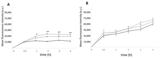 The THP-1-differentiated macrophages were seeded in 24-well plates at a density of 6 × 105 cells/well in supplemented RPMI and were incubated with FITC-loaded F/C nanoparticles at 37 °C and a 5% CO2 atmosphere. After specific times, the cells were washed with PBS pH 7.4 to remove the noninternalized nanoparticles and detached with 0.25% trypsin-EDTA. The solution was centrifuged at 300× g for 5 min, using an Allegra®X-15R centrifuge (Beckman Coulter, Pasadena, CA, USA), and then the cells were recovered in 100 µL of PBS. Prior to the flow cytometry analysis, 1 µL of trypan blue was added to eliminate the fluorescence of the nanoparticles that did not internalize the cells, and 1 µL propidium iodide, to exclude the dead cells. For each sample, a minimum of 10,000 events were recorded, under FL1 in a flow cytometer (AccuriTM, BD Biosciences, Erembodegem, Belgium).
