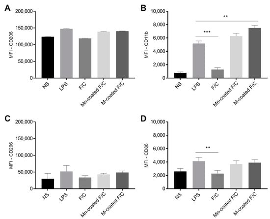 On the THP-1 monocytes and differentiated macrophages, the level of MR upon the incubation with the uncoated, Mn-coated, and M-coated F/C nanoparticles remain unchanged in relation to the LPS-stimulated cells and are similar to non-stimulated cells (Figure 5A, no significant statistical differences). However, CD11b surface marker expression is modulated in the THP-1 monocytes with the presence of carbohydrate-coated nanoparticles (Figure 5B). A significant increase in CD11b expression occurs in the presence of Mn- and M-coated F/C nanoparticles, similar to exposure to LPS, and has a statistically significant difference compared to the non-stimulated monocytes (p < 0.001), LPS (p < 0.05 and p < 0.01, respectively), and uncoated-F/C nanoparticles (p < 0.001). Thus, the carbohydrate-coated nanoparticles elicit the activation and maturation of monocytes as observed for the LPS stimulation. For the THP-1-differentiated macrophages, both functionalized F/C nanoparticles induced a higher expression of the co-stimulatory CD86 molecule as compared to the uncoated-F/C nanoparticles, which is similar to the LPS stimulation (Figure 5D). Others have reported an increase in surface markers expression for the carbohydrate-functionalized polymeric nanoparticles [8,21,22]. Macrophage surface modulation may also result in the secretion of cytokines that could trigger the T cells’ immune response. In fact, cytokine secretion is one of the most relevant indicators of macrophage polarization. The profile of cytokines produced by THP-1-differentiated macrophages with the uncoated, Mn-coated, and M-coated F/C nanoparticles was evaluated by determining the production of pro-inflammatory cytokines, including IL-1β, IL-6, and TNF-α (Table 2).