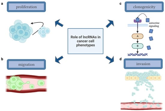 Overview of lncRNA roles in cancer cell phenotypes. lncRNA molecules modulate gene expression and protein localization in cells, thus driving central carcinogenic phenotypes such as (a) establishing cellular immortality; (b) gain-of-function or unregulated motility of cancer cells, diving cellular migration; (c) promoting the self-growth and sufficiency of cancer cells by driving autocrine signaling; and (d) contributing to the ability of a cancer cell to degrade an extracellular matrix and invade local and distant tissues, contributing to metastasis. [Figure adapted from BioRender.com].