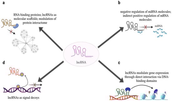 Roles of lncRNAs within the cell. lncRNAs have been mainly identified to function as (a) protein scaffolds via extensive protein-binding domains, thereby modulating the protein interactome; (b) negative regulators of miRNAs via sequence complementarity of appropriate seed length; (c) molecular scaffolds via DNA-binding domains; and (d) signals and signal decoys that directly mediate gene expression. [Figure adapted from BioRender.com].