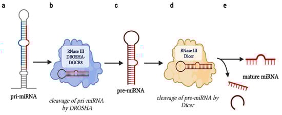 Processing of primary miRNA transcripts into mature miRNA molecules. (a) miRNAs are produced as pri-miRNA transcripts; (b) pri-miRNA transcripts are enzymatically processed via RNase III DROSHA-DCRG8 complex, producing (c) pre-miRNA transcripts that are (d) enzymatically processed into mature miRNA molecules via the RNase III Dicer; (e) the entire biological process yields mature miRNA transcripts that contain a 5′ terminal phosphate and a 3′ hydroxyl group, and is structurally competent for mRNA targeting. [Figure adapted from BioRender.com].