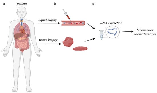 Presence of RNA molecules in liquid and tissue biopsies. (a) lncRNA molecules are present in body fluids and tissue samples, making them excellent candidates for detection; (b) RNA extraction from patient samples from multiple routes, aiding in (c) the rapid identification and classification of markers in a spectrum of cancer types. [Figure adapted from BioRender.com].