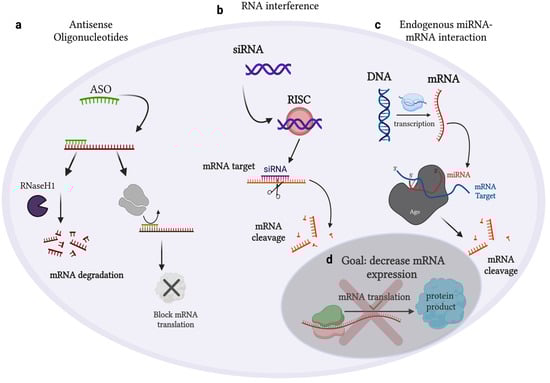 Endogenous cellular mechanisms of RNA therapeutics. (a) ASOs can directly cleave an RNA target or block (via steric hindrance) an RNA molecule in order to hinder expression of the mRNA target; (b) synthetic dsRNA molecules, known as siRNAs, exert similar biological functions as miRNAs and target mRNA molecules in a sequence-specific fashion, leading to mRNA cleavage via RISC-mediated catalysis; (c) physiological process of mRNA regulation via miRNA interactions; (d) the goal of RNA therapeutics is to target mRNAs in a highly sequence-specific fashion and block the translation of a functional protein product that has been identified to contribute to pathological conditions. [Figure adapted from BioRender.com].