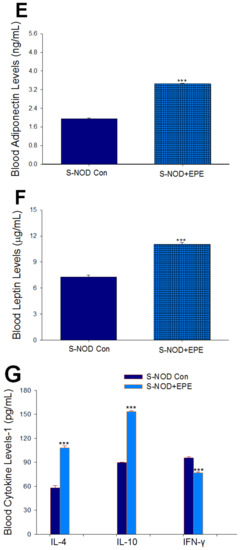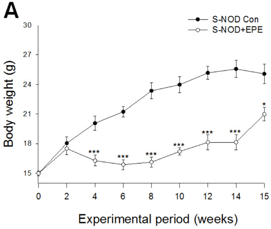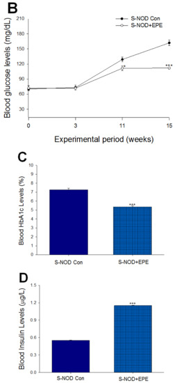 As shown in Figure 2A, for treatment with EPE for 15 weeks, the S-NOD+EPE mice showed a decrease in body weight compared with the S-NOD-Con group treated with EPE from week 4 to week 15 (Figure 2A). S-NOD+EPE mice showed a decrease in relative spleen weights compared with the S-NOD-Con group (p < 0.05, respectively) (Table 1). Due to the large variation between the two groups (in addition to the relative spleen weights), there was no change in the relative tissue weight compared with the S-NOD-Con group. Figure 2B shows the blood glucose levels of the initial time and the EPE-treated mice during the experimental 15 weeks. S-NOD+EPE mice had lowered blood glucose levels compared with the S-NOD-Con group at week 11 and week 15 (p < 0.05, p < 0.001, respectively) (Figure 2B). S-NOD+EPE mice had lowered blood HbA1C concentrations compared with the S-NOD-Con group (p < 0.001) (Figure 2C). S-NOD+EPE mice showed a significant increase in blood insulin, adiponectin, and leptin levels compared with the S-NOD-Con group (p < 0.001, p < 0.001, p < 0.001, respectively) (Figure 2D–F).