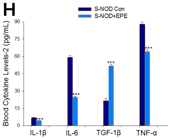 Blood cytokine data show that EPE-treated S-NOD mice had decreased blood levels of IFN-γ, TNF-α, IL-1β, and IL-6 (p < 0.001, p < 0.001, p < 0.001, p < 0.001, respectively) (Figure 2G,H), but increased blood levels of IL-4, IL-10, and TGF-β1 (p < 0.001, p < 0.001, p < 0.001, respectively) by ELISA analysis compared with the S-NOD-Con group (Figure 2G,H).