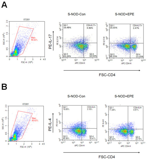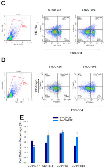 Flow cytometric data show that EPE-treated S-NOD mice had a decreased CD4+ subsets T cell distribution of CD4+IL-17 (Figure 3A), but an increased CD4+ subsets T cell distribution of CD4+IL-4 (Figure 3B) and CD4+ forkhead box P3 (Foxp3) (Figure 3D) compared with the S-NOD-Con group. No difference was observed on CD4+ interferon gamma (IFN-γ+) between the S-NOD+EPE group and the S-NOD-Con group (Figure 3C). EPE-treated S-NOD mice had a decreased percentage per 10,000 cells of CD4+IL-17, CD4+IL-4, and CD4+Foxp3 compared with the S-NOD-Con group (p < 0.001, p < 0.05, p < 0.05; respectively) (Figure 3E).
