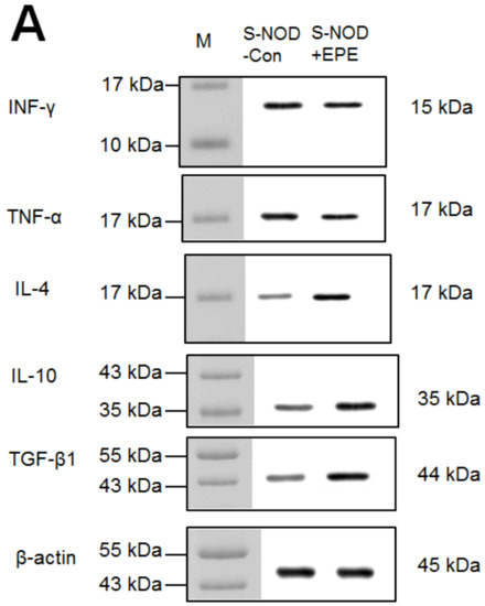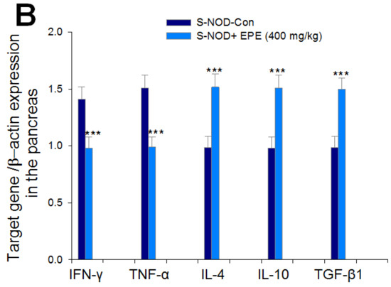 The EPE-treated S-NOD group showed a marked decrease in the expression levels of interferon gamma (IFN-γ) and tumor necrosis α (TNF-α), but a significant increase in the expression levels of IL-4, IL-10, and transforming growth factor-β1 (TGF-β1) in the pancreas compared with the S-NOD-Con group (p < 0.001, p < 0.001, p < 0.001, p < 0.001, p < 0.001, respectively) (Figure 4A,B).
