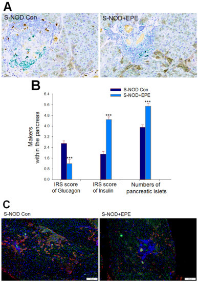 Pathogenesis photographs revealed that administration of EPE to S-NOD mice caused an increase in pancreatic insulin-expressing β cells (brown) compared with S-NOD Con mice (p < 0.001) (Figure 5A). EPE-treated S-NOD mice showed a significant decrease in the average immunoreactive system (IRS) score of glucagon but an increase in the average IRS score of insulin within the pancreas, and an enhanced number of the pancreatic islets compared with the S-NOD Con group (p < 0.001, p < 0.001, p < 0.001, respectively) (Figure 5B).