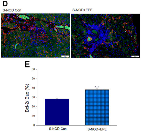 The green fluorescence/red fluorescence represents Bcl-2/Bax per cell under one vision. EPE-treated S-NOD mice showed a significant increase in the percentage of Bcl-2 (green)/Bax (red) compared with the S-NOD-Con mice by fluorescent staining analysis of islets counting by Image J software at 100× or 200× (p < 0.001, p < 0.001, respectively) (Figure 5C–E).