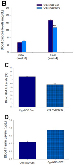 As shown in Figure 6, for the treatment with EPE for 4 weeks, EPE-treated mice showed a decrease in body weight at week 1 (p < 0.05), there was no difference in week 2, 3, or the final body weight (week 4) between the Cyp-NOD+EPE group and the Cyp-NOD-Con group (Figure 6A). Cyp-NOD+EPE mice showed both a decrease in relative tissue weights of spleen and skeletal muscle compared with the Cyp-NOD-Con group (p < 0.05, p < 0.05, respectively) (Table 2). As shown in Figure 6B, there was no difference in blood glucose levels between Cyp-NOD Con mice and Cyp-NOD+EPE mice at the initial time (week 0). At the final time (week 4), Cyp-NOD+EPE mice had significantly lower blood glucose levels compared with the Cyp-NOD Con group (p < 0.001) (Figure 6B). Cyp-NOD+EPE mice had significantly lower blood HbA1C concentrations compared with the Cyp-NOD Con group (p < 0.001) (Figure 6C). Cyp-NOD+EPE mice showed a significant increase in blood insulin, adiponectin, and leptin levels compared with the Cyp-NOD-Con group (p < 0.001, p < 0.001, p < 0.001, respectively) (Figure 6D–F).