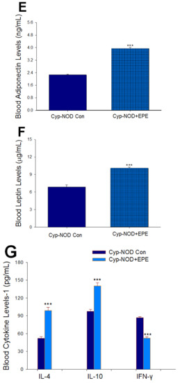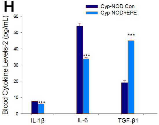 Blood cytokine data show that EPE-treated Cyp-NOD mice had decreased blood levels of IFN-γ, IL-1β, and IL-6 (p < 0.001, p < 0.01, p < 0.001, respectively), but increased blood levels of IL-4, IL-10, and TGFβ-1 (p < 0.001, p < 0.001, p < 0.001, respectively) by ELISA analysis compared with the Cyp-NOD Con group (Figure 6G,H).