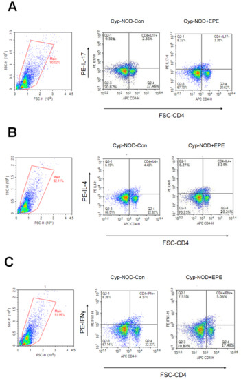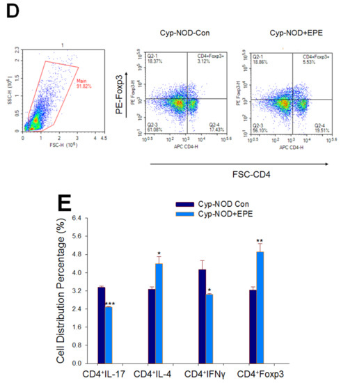 Flow cytometric data show that EPE-treated Cyp-NOD mice had a decreased CD4+ subsets T cell distribution of CD4+IL-17 and CD4+IFN-γ (Figure 7A,B), but an increased CD4+ subsets T cell distribution of CD4+IL-4 and CD4+Foxp3 compared with the Cyp-NOD Con group (Figure 7C,D). EPE-treated Cyp-NOD mice had a decreased percentage per 10,000 cells of CD4+IL-17 and CD4+IFNγ, and increased CD4+IL-4 and CD4+Foxp3 compared with the Cyp-NOD Con group (p < 0.001, p < 0.05, p < 0.05, p < 0.05, respectively) (Figure 7E).