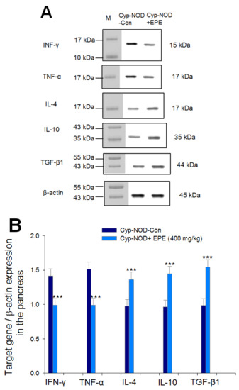 The EPE-treated Cyp-NOD group showed a marked decrease in the expression levels of IFN-γ and TNF-α, but a significant increase in the expression levels of IL-4, IL-10, and TGF-β1 in the pancreas compared with the Cyp-NOD-Con group (p < 0.001, p < 0.001, p < 0.001, p < 0.001, p < 0.001, respectively) (Figure 8A,B).