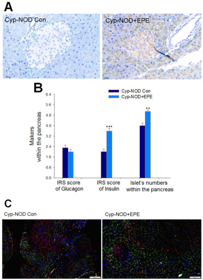 Pathogenesis photographs revealed that administration of EPE to Cyp-NOD mice caused an increase in pancreatic insulin-expressing β cells (brown) compared with Cyp-NOD Con mice (p < 0.001) (Figure 9A). EPE-treated Cyp-NOD mice had a significantly increased average IRS score of insulin within the pancreas, and an enhanced number of the pancreatic islet numbers compared with the Cyp-NOD Con group (p < 0.001, p < 0.01, respectively) (Figure 9B).