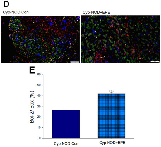 EPE-treated Cyp-NOD mice showed a significant increase in the percentage of Bcl-2/Bax compared with the Cyp-NOD Con group by fluorescent staining analysis of islets at 100× or 200× (p < 0.001) (Figure 9C–E).