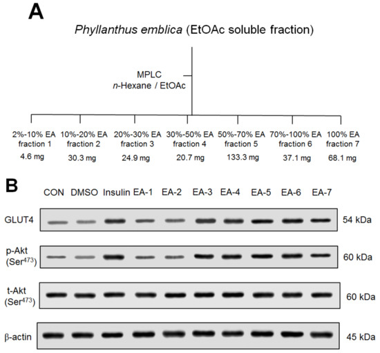 Since membrane GLUT4 and p-Akt/t-Akt play critical roles in type 1 diabetes, the cell culture analyses of expressions of GLUT4 and p-Akt/t-Akt were determined to clarify the anti-diabetic activity using Western blot with antibodies specifically as those above. Briefly, the treatments of cells with seven fractions of ethyl acetate from P. emblica (including EA-1~EA-7) or insulin were initiated on day 6 as per our previous publication [59].