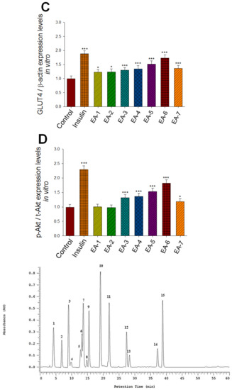 The preparation procedure of seven fractions of EPE was described in Figure 10A. Seven fractions of EPE (EA) are described as EA. EA included 2~10% EA fraction 1 (EA-1), 10~20% EA fraction 2 (EA-2), 20~30% EA fraction 3 (EA-3), 30~50% EA fraction 4 (EA-4), 50~70% EA fraction 5 (EA-5), 70~100% EA fraction 6 (EA-6), and 100% EA fraction 7 (EA-7). Glucose transporter 4 (GLUT4) is known to play a central role in blood glucose homeostasis [26]. Either the stimulation of insulin or contraction facilitates glucose uptake by translocate GLUT4 to the cell membrane [27,28]. The mechanisms of promoting glucose uptake into skeletal muscle include the insulin-dependent mechanisms leading to activation of Akt/PKB and contraction-regulated stimulation [29,30]. Therefore, we chose membrane GLUT4 and activation of Akt/PKB as anti-diabetic target genes. Figure 10B,C show that the insulin-, EA-3-, EA-4-, EA-5-, EA-6-, and EA-7-treated groups had increased expression levels of membrane GLUT4 or raised Akt activation (phospho-Akt/total-Akt; p-Akt/t-Akt) in comparison to the control group. Our findings show that EA-6 displays the best activity of phospho-Akt/total-Akt and expression levels of GLUT4 in vitro. This study was then designed to explore the marker ingredient of EPE responsible for the anti-diabetes.