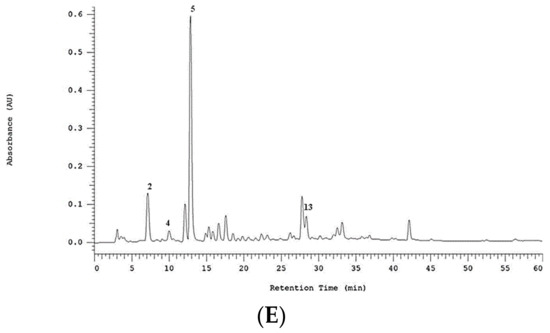 This study was designed to examine whether polyphenolic compounds were found in the EA-6 fraction or not. The retention time of gallic acid was 4.3 min as a reference compound to analyze the EA-6 fraction qualitatively and quantitatively. As shown in Figure 10E, the major absorption peaks of phenolic acids were consistent with the Photo Diode Array (PDA) spectra of the reference materials.