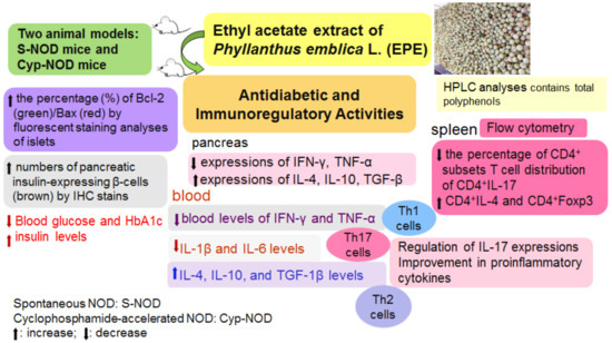 The graphical abstract of the effects of ethyl acetate extract from Phyllanthus emblica L. in NOD with spontaneous and cyclophosphamide-accelerated diabetic mice.