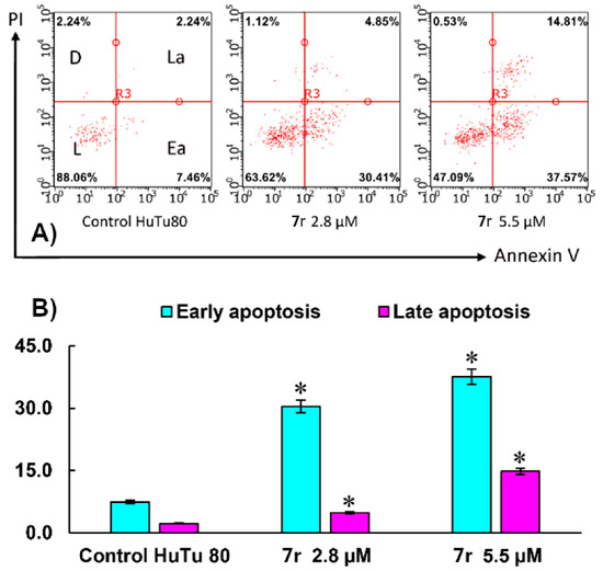 (A) Induction of apoptosis in HuTu 80 cells incubated with compound 7r at concentration IC50/2 (2.8 µM) and at concentration IC50 (5.5 µM) in HuTu 80 cells; L—living cells; D—dead cells; Ea.—early apoptotic cells; La.—late apoptotic cells; (B) Percentage of early apoptotic cells (cyan) and late apoptotic cells (magenta) in control HuTu 80 cells and HuTu 80 cells treated with compound 7r. Data are presented as mean ± SD of three independent experiments. * Values indicate p < 0.05 compared to control.