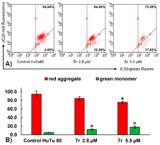 (A) Effects on the mitochondrial membrane potential by compound 7r at concentration IC50/2 (2.8 µM) and at concentration IC50 (5.5 µM); (B) percentage of J-aggregates (red) and J-monomers (green) in control HuTu 80 cells and HuTu 80 cells treated with compound 7r. Data are presented as mean ± SD of three independent experiments. * Values indicate p < 0.05 compared to control.