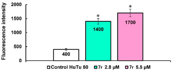 Induction of ROS production by compound 7r at concentration IC50/2 (2.8 µM) and at concentration IC50 (5.5 µM). Data are presented as mean ± SD of three independent experiments. * Values indicate p < 0.05 compared to control.