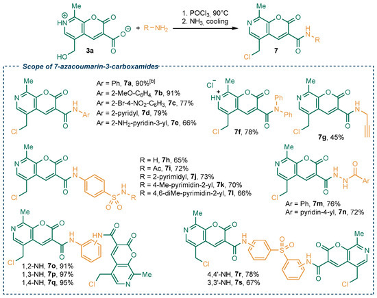Having optimized the synthesis of 7-azacoumarin-3-carboxylic acid 3a, we screened the most optimal method of its conversion to the target amides. A number of amide bond-forming reactions and coupling reagents have been developed so far [34,35,36], including the electrosynthetic [37] and photocatalytic [38] methods. However, the most straightforward and mature approach via transient acyl halide formation was proven to be the most effective in terms of reagents availability, reaction scope, and product yield in our case. Preliminary studies with compound 3a and aniline indicated that the phosphorus oxychloride was superior to other chlorinating reagents tested (thionyl halides and oxalylchloride). Importantly, this approach allowed the simultaneous replacement of the hydroxyl group by chlorine atom in compound 7a, which is useful if further modification via nucleophilic substitution is considered. Interestingly, the phosphoryl-substituted acid 3b could also be used instead of compound 3a, leading to the same amide 7a.