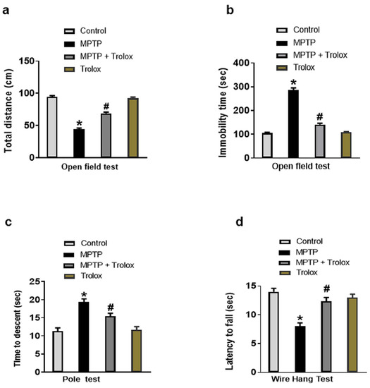 It has been reported that MPTP administration induced Parkinson’s disease, and behavioral and motor dysfunctions in normal mice [18,19]. We also performed behavioral tests to investigate the effects of Trolox on motor functions in experimental animals. According to the open field test, the overall distance traveled by the MPTP-treated mice was significantly reduced in comparison to normal mice, whereas Trolox-treated mice greatly reversed this effect (Figure 1a). Moreover, the MPTP-treated mice showed increased immobility time in comparison to saline-treated mice, but Trolox administration significantly reduced this effect (Figure 1b). In the pole test, the MPTP-treated mice demonstrated a substantial increase in the time taken to pivot and reach downward, whereas this impact was considerably diminished with Trolox administration (Figure 1c). The MPTP rodents revealed decreased holding time during the wire hang test, suggesting that the MPTP drug had a substantial negative impact on neuromuscular strength and has been increased with Trolox treatment (Figure 1d). Our findings showed that, Trolox significantly enhanced motor and cognitive functions in the MPTP-induced PD mouse model.
