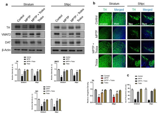 Tyrosine hydroxylase (TH), vesicular monoamine transporter 2 (VMAT2), and dopamine transporter (DAT) are dopaminergic neuronal markers that are responsible for dopamine synthesis and transport. The loss of these proteins is involved in PD pathogenesis. Our western blot results showed that the expressions of TH, VMAT2, and DAT were significantly reduced in the striatum and SNpc of the MPTP-induced PD mouse model in comparison to the saline-treated control mice, whereas the administration of Trolox significantly increased the expression of these markers (Figure 3a). We further confirmed our findings through immunostaining, which showed the decreased immunoreactivity of TH in the striatum and SNpc of the PD mouse models, while Trolox treatment substantially increased this expression (Figure 3b). We further evaluated the TH-positive neuron by using ImageJ software (NIH, Maryland MA, USA). Our findings suggested the decrease of TH-positive neurons in MPTP-treated rodents, while Trolox treatment increased them significantly (Figure 3c).
