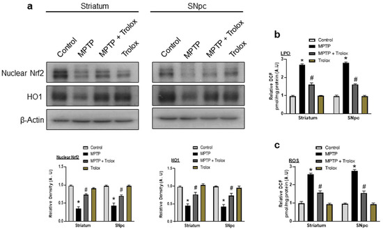 Trolox protects dopaminergic neurons from MPTP-induced oxidative stress. (a) Images of the scanned immunoblot findings and their graphic representation (Nrf2/HO-1 expression in the striatum and SNpc of the different experimental groups. β-actin is used as a loading control); (b) figures showing the levels of reactive oxygen species (ROS) in the striatum and SNpc of the various experimental groups; (c) figures showing the outcomes of the lipid peroxidation (LPO) test in the various experimental groups. The values are given as the mean ± SD for the proteins specified (n = 10 mice/group), and there were three separate trials. The significant differences have been given in the graphs. * Significant difference between the control and MPTP group; # significant difference between the MPTP group and Trolox-treated mice. Significance: * p < 0.05; # p < 0.05.