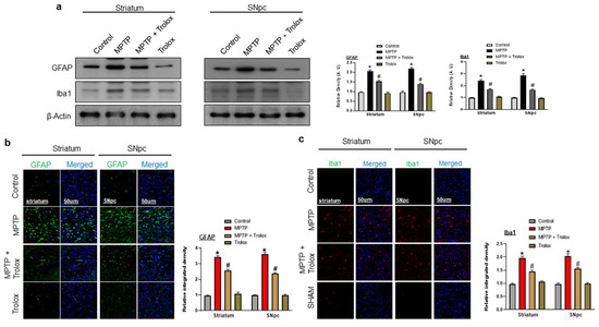 The MPTP-treated mice reported activated astrocytosis and microgliosis [23]. In the PD brain, a small amount of α synuclein protein is released from neuronal cells, is taken by glial cells, and induces the expression of genes that are associated with immune functions [24]. Iba1 (ionized calcium-binding adaptor protein-1), and GFAP (glial fibrillary acidic protein) are two specific markers of activated microglial and astrocytic cells in the brain, respectively [25]. We also evaluated the effects of Trolox on activated glial cells. Our western blot results showed an increased expression of GFAP and Iba1 in MPTP-injected mice. However, this effect was significantly reversed by treatment with Trolox (Figure 5a). We confirmed our results further through confocal microscopy, which showed an increased immunoreactivity of GFAP and Iba1 in the striatum and SNpc of PD mouse models, while Trolox treatment substantially decreased this expression (Figure 5b,c).