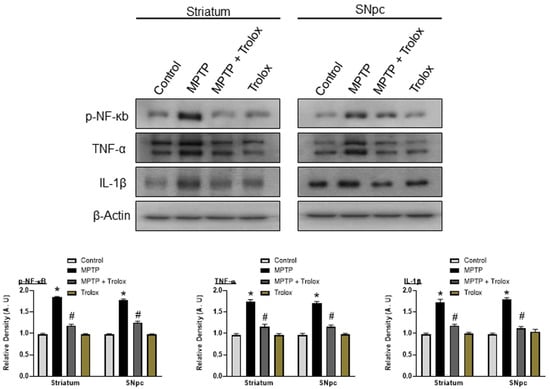 The activated glial cells further release proinflammatory cytokines, which contributes to the etiology of PD. The nuclear factor-κB (NF-κB) is involved in various cellular processes and contributes to inflammatory responses. The phosphorylated NF-κB, plays a major role in neuroinflammation. It also activates the expression of other genes, such as tumor necrosis factor α (TNF-α) and interleukin-1β (IL-1β), which further induce neuroinflammation and neurodegeneration [26,27]. We also examined these inflammatory markers p-NFκB, TNF-α, and IL-1β by western blotting, and the results showed an increased expression of these markers in the striatum and SNpc of the MPTP-injected mice, while treatment with Trolox decreased the expression of these inflammatory markers in the PD mouse striatum and SNpc (Figure 6), suggesting that Trolox has a potent and effective role against MPTP-induced neuroinflammation.