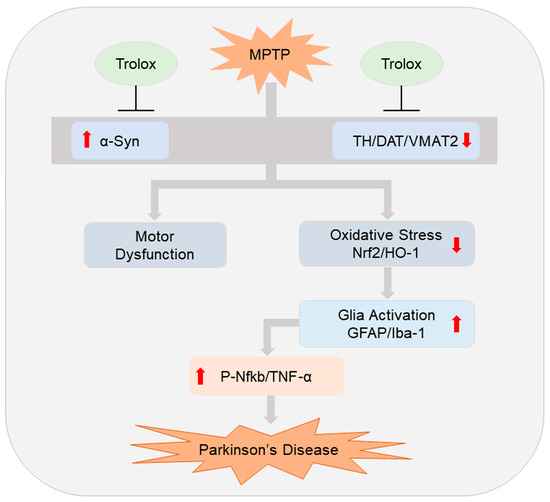 Neuroprotective Mechanism of Trolox against MPTP-induced PD. (increase ↑, decrease ↓).