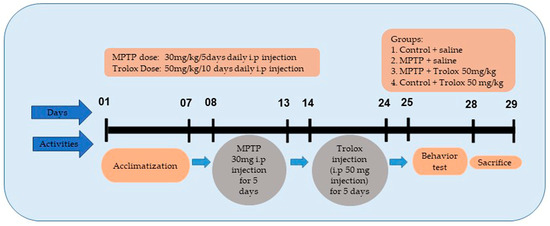 Male wild-type (WT) C5BL/6N mice, eight weeks old and of an average weight of 25–30 g, were purchased from Samtako Bio labs (Ulsan, Republic of Korea). All mice were acclimatized for one week. They were housed at room temperature (25 °C) and were provided a 12 h dark/light cycle with 60 ± 10% humidity. After acclimating, the mice were divided into four groups (n = 10 mice per group): (1) a control group (receiving 0.9% saline); (2) an MPTP-treated group (MPTP was injected at a dose of 30 mg/kg intravenously for 5 days), as previously used [42]; (3) a Trolox-treated group (intraperitoneally treated with Trolox at a dose of 50 mg/kg for 10 days); (4) The sham-treated group (Trolox 50 mg/kg i.p for 10 days) (Figure 8). All the experiments involving animals were implemented in agreement with guidelines and principles approved by the Institutional Animal Care and Use Committee (IACUC), Division of Applied Life Sciences, Gyeongsang National University, Republic of Korea (Approval ID: 125).