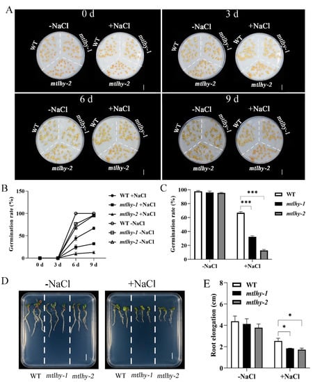 MtLHY mutation impaired seed germination and seedling growth under NaCl stress: Seed germination phenotype of mtlhy mutants and WT with or without a 150 mM NaCl treatment (A). Statistical analysis of seed germination rate of mtlhy mutants and WT with or without a 150 mM NaCl treatment (B,C). The seedling phenotype of mtlhy mutants and WT with or without a 150 mM NaCl treatment (D). Statistical analysis of root length of mtlhy mutants and WT with or without a 150 mM NaCl treatment (E). Data are shown as means ± SD (n = 3; * p < 0.05, *** p < 0.001, based on Dunnett test). Scale bar, 1 cm.