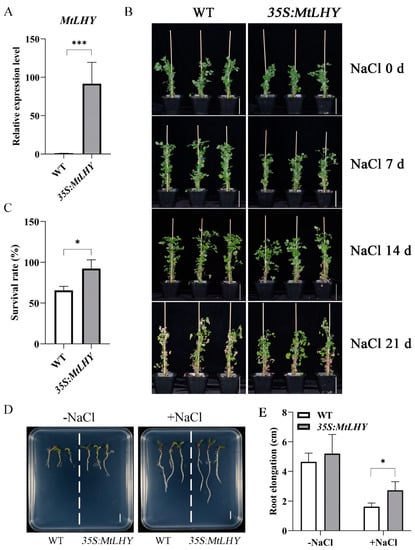 MtLHY overexpression improves salt stress tolerance in M. truncatula: The expression level of MtLHY in MtLHY-overexpressing plants (A). MtLHY-overexpressing plants were shown to be resistant to salt treatment with 150 mM NaCl for 3 weeks (B). Statistical analysis of the survival rate of WT and MtLHY-overexpressing plants at treatment with 150 mM NaCl for 3 weeks (C). The seedling phenotype of MtLHY-overexpressing plants and WT with or without a 150 mM NaCl treatment (D). Statistical analysis of root length of MtLHY-overexpressing plants and WT with or without a 150 mM NaCl treatment (E). Data are shown as means ± SD (n = 3; * p < 0.05, *** p < 0.001, based on two-tailed t-tests). Scale bars, 10 cm in (B) and 1 cm in (D).