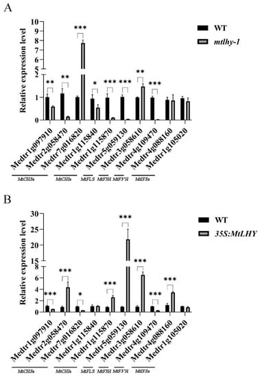 MtLHY is involved in flavonoid biosynthesis: The transcript levels of known flavonoid biosynthesis genes, such as MtCHS, MtCHI, MtFLS, MtF3, MtF3’H, and MtIFS, were examined in both mtlhy mutants and MtLHY-overexpressing plants compared with those in WT (A,B). Data are shown as means ± SD (n = 3; * p < 0.05, ** p < 0.01 *** p < 0.001, based on two-tailed t-tests).