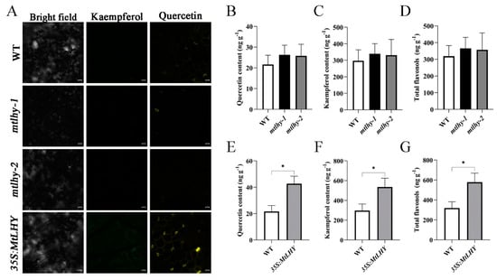 As we know, FLS encodes flavonol synthase that catalyzes the formation of flavonols from dihydroflavonols. Based on the fact that MtFLS is likely induced by MtLHY, we hypothesize that MtLHY plays a crucial role in flavonol biosynthesis. To test this hypothesis, we investigated the flavonol content in WT, MtLHY, and MtLHY-overexpressing plants. We used diphenylboric acid 2-aminoethyl ester (DPBA) to image flavonol accumulation in leaves, as DPBA is a fluorescent dye that binds specifically to two flavonols, kaempferol and quercetin []. Significant DPBA fluorescence signals were detected in the guard cells of MtLHY-overexpressing plants (Figure 7A). However, weak DPBA fluorescence signals were observed in both WT and mtlhy mutants, with no significant difference (Figure 7A). These data suggest that overexpression of MtLHY leads to flavonol accumulation in guard cells. To demonstrate changes in flavonol and flavonoid abundance under salt stress, we performed high-pressure liquid chromatography–mass spectroscopy (LC-MS) to quantify flavonol and total flavonoids concentrations in WT, mtlhy mutants, and MtLHY-overexpressing plant leaves. We found no difference in the content of total flavonoids between WT and mtlhy mutants (Figure 7D). The two flavonol components, kaempferol and quercetin, also showed no difference between WT and mtlhy mutants (Figure 7B,C), indicating that the content of both kaempferol and quercetin in mtlhy mutants is not the primary factor causing the hypersensitivity phenotype to salt stress. However, the content of total flavonoids, including kaempferol and quercetin, was significantly higher in the MtLHY-overexpressing plant compared with WT (Figure 7E–G). Taken together, overexpression of MtLHY enhances the accumulation of flavonoids, including kaempferol and quercetin.