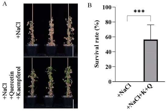 Application of exogenous flavonols enhances salt stress tolerance in M. truncatula: Application treatment of WT plants with exogenous 15 μm kaempferol and 15 μm quercetin in the Hoagland nutrient solution under 150 mM salt stress conditions. Kaempferol and quercetin were dissolved in ethanol separately, and the control sample was treated with an equal volume of ethanol (A). Under salt stress conditions, statistical analysis of the survival rate of the WT plants with or without the exogenous application of kaempferol (K) and quercetin (Q) (B). Data are shown as means ± SD (n = 3; *** p < 0.001, based on two-tailed t-tests). Scale bar, 10 cm.