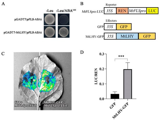 MtLHY transcriptionally activates MtFLS: A yeast one-hybrid (Y1H) assay showed that the MtLHY protein binds to the promoter sequences of MtFLS (A). Schematic representations of the reporter and effector constructs were used in the transient expression assay (B). A dual luciferase assay showed MtLHY increased the expression of LUC driven by the promoter of MtFLS (C,D). Data are shown as means ± SD (n = 4; *** p < 0.001, based on two-tailed t-tests).