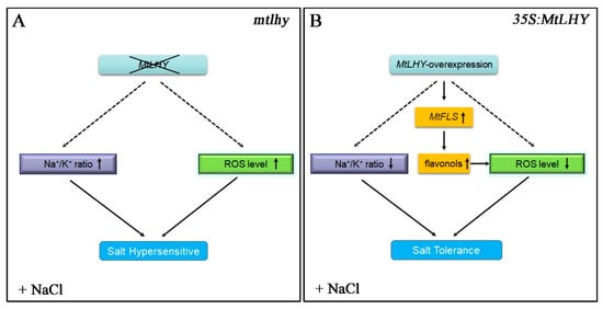 A proposed working model for mtlhy mutants and MtLHY-overexpressing plants under salt stress: A proposed working model for mtlhy mutants under salt stress (A). A proposed working model for MtLHY-overexpressing plants under salt stress (B). The dotted arrow means the indirect ation and the solid arrow means the direct ation.