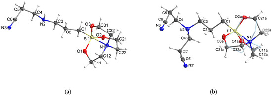Molecular structure of compounds 2a (a) and 2b (b). Atomic displacements for non-hydrogen atoms are shown at 50% probability. An alternative conformation of the silatrane fragment (Oxb, Cxxb) of 2b is indicated with pale blue sticks.