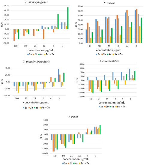 To begin with, we evaluated the effect of selected silatranes 2a, 2b, 4a, 5a, and 7a at a concentration of 400–200 μg/mL on the growth of microorganisms using a method of broth serial dilution and a method of diffusion into agar [50]. It was shown that the studied compounds insignificantly inhibited the growth of all microorganisms (Inhibition Index—II by an average of 33.7 ± 9.5%). At a lower concentration (100 µg/mL), silatranes 2a, 2b, 4a, 5a, and 7a even more weakly inhibited the growth of test strains L. monocytogenes, Y. pestis, Y. enterocolitica, and Y. pseudotuberculosis (II by an average of 16.2 ± 8.5 %). In the experiments using the diffusion method into HA, no zones of inhibition were observed.