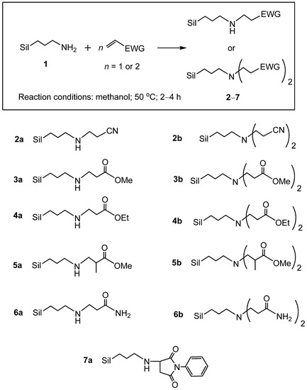 - Feng, L.; Zhu, S.; Zhang, W.; Mei, K.; Wang, H.; Feng, S. Preparation and Characterization of Functional Alkoxysilanes via Catalyst-Free Aza-Michael Reaction. ChemistrySelect 2017, 2, 3721–3724. [Google Scholar] [CrossRef]